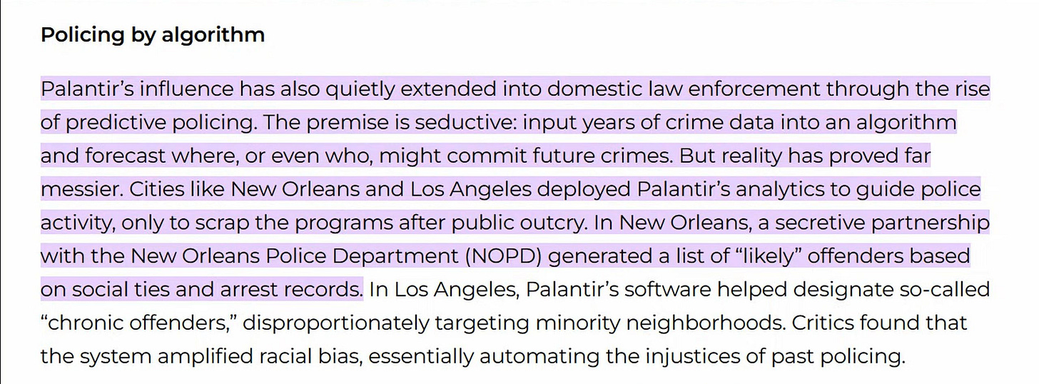 In August 2025, Palantir was awarded a 10 billion dollar contract with the US Army — the largest software data contract in military history. What does it do? According to Palantir’s own promotional materials, “Palantir Gotham is a commercially available, AI-ready operating system designed to improve and accelerate decision-making for operators across defense, intelligence, law enforcement, and other high-stakes domains.” Well, let’s read between the lines of their watered-down marketing jargon, shall we?