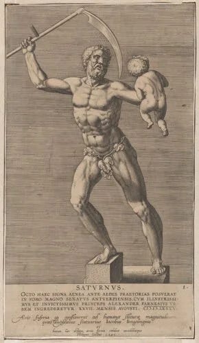 Many of its customs were recast into the seasonal celebrations surrounding Christmas and the New Year. Saturn also had a less benevolent aspect. One of his consorts was Lua, sometimes called Lua Saturni (“Saturn’s Lua”). She’s also identified as Lua Mater, or “Mother Destruction.” Weapons of enemies killed in wars were burned in her honor, perhaps in expiation. Saturn’s unruly greedy nature connected him to the underworld and its ruler Dis Pater.